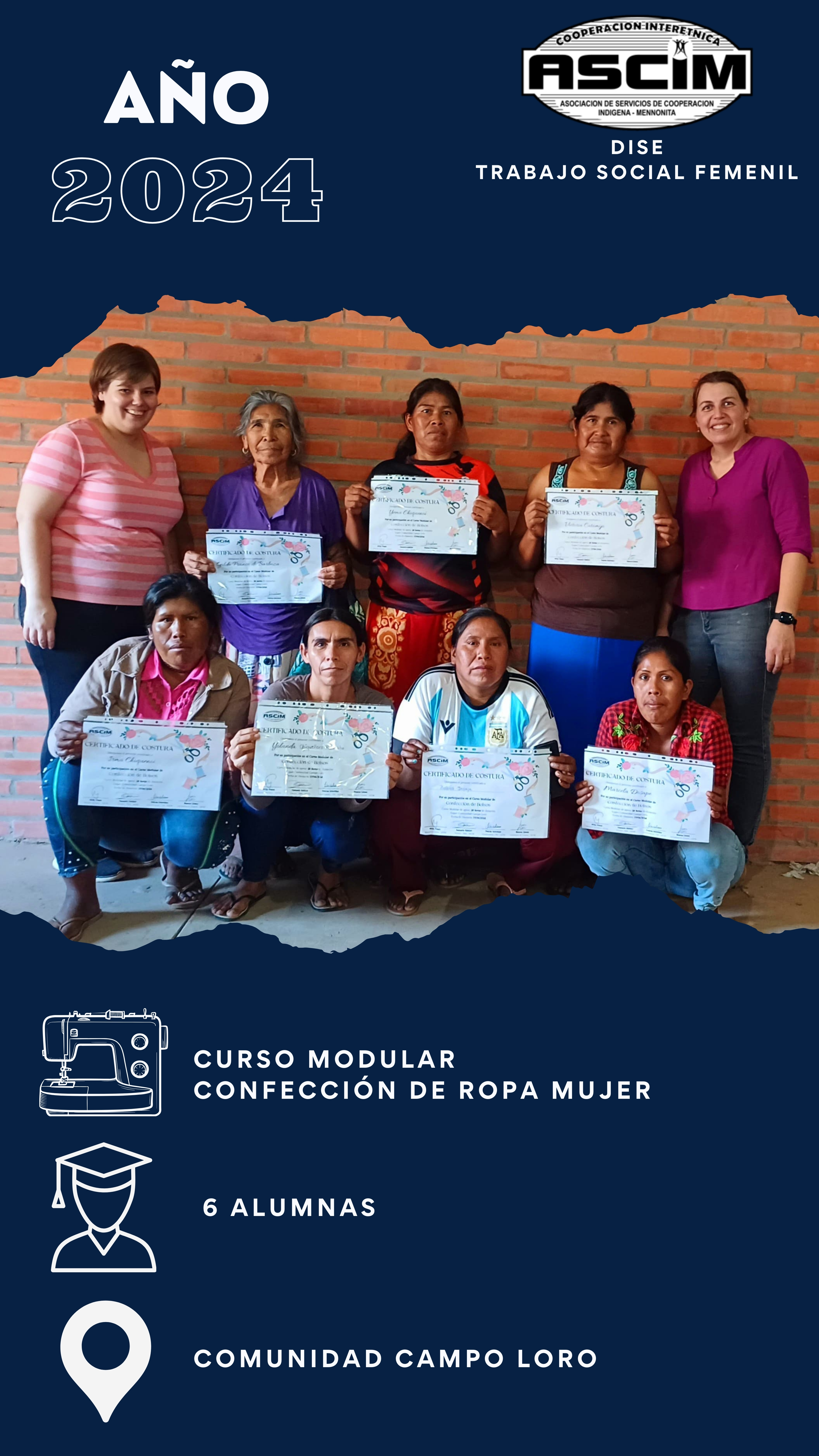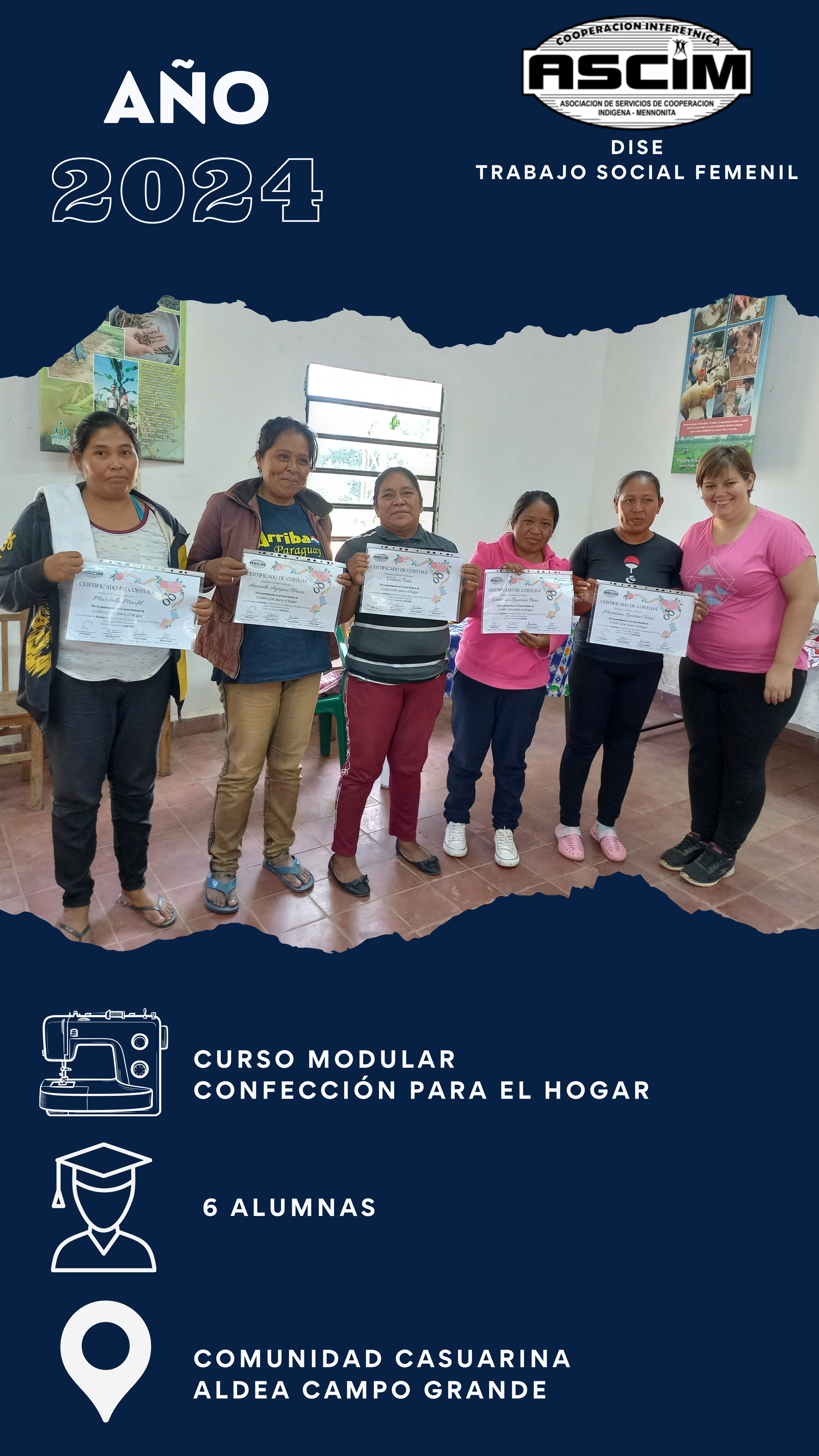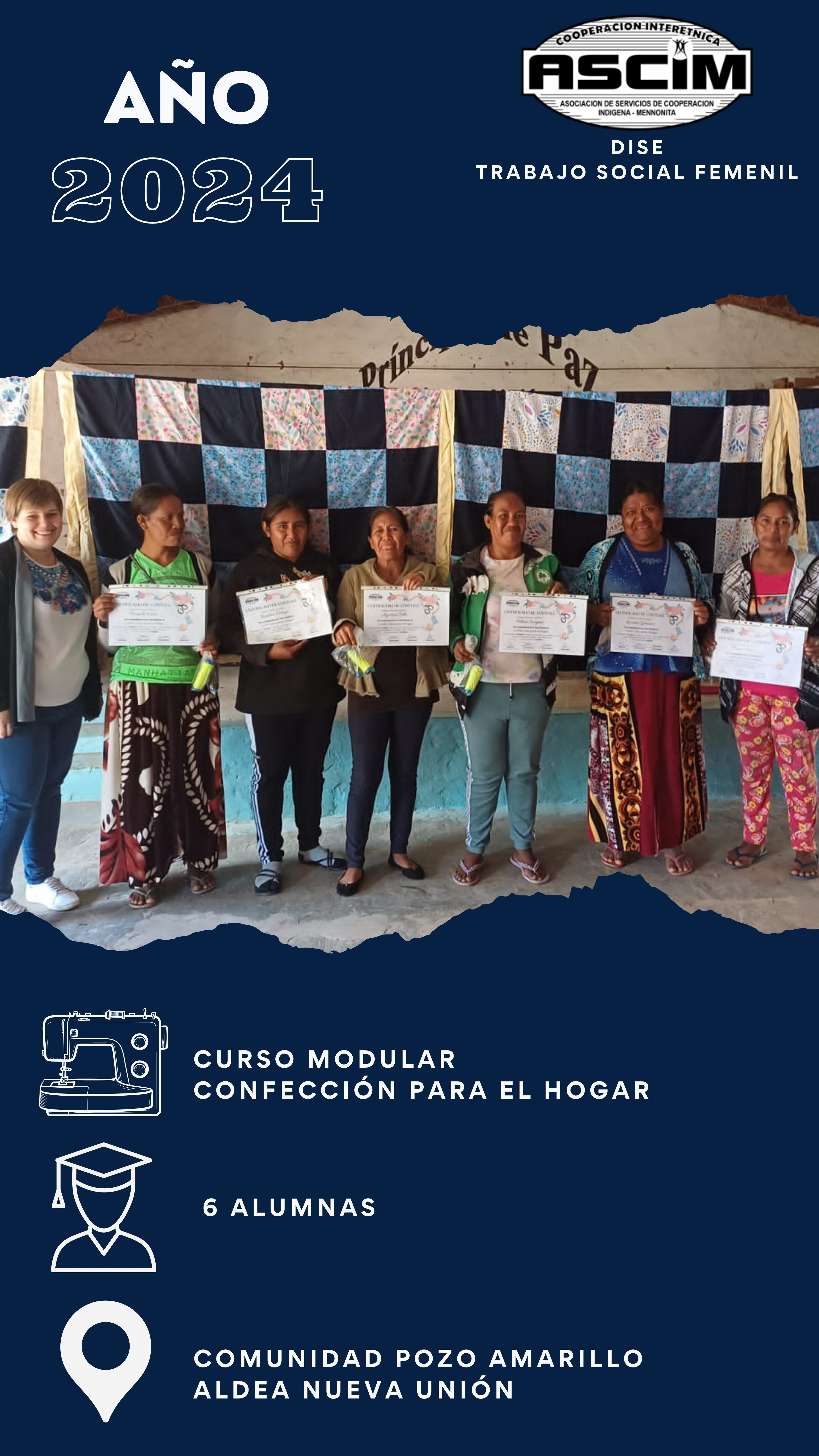 En el presente semestre, la Asociación de Servicios de Cooperación Indígena Mennonita (ASCIM) ha llevado a cabo cursos de costura en varias comunidades indígenas, proporcionando una oportunidad para el desarrollo de habilidades prácticas. Las comunidades beneficiadas incluyen Nicha Toyish, Yalve Sanga, Comunidad Nivacle Unida, Pozo Amarillo, Paz del Chaco, Casuarina, Campo Alegre, Campo Largo y Campo Loro.